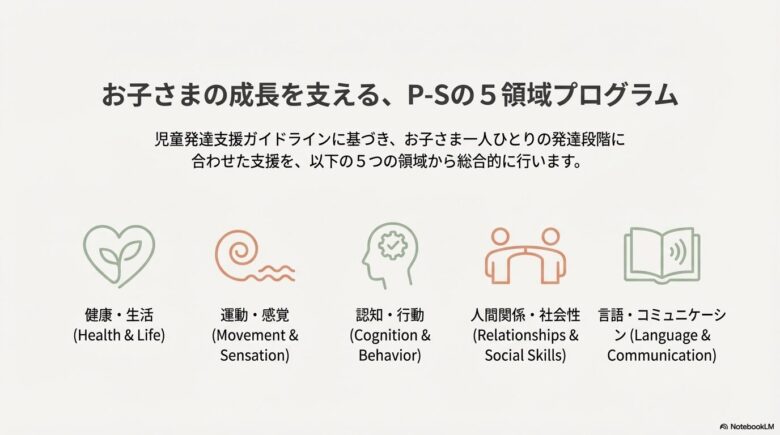 支援プログラムに定める内容が、個別支援計画に繋がっていくものとなるように5領域を踏まえた内容を記載しました。